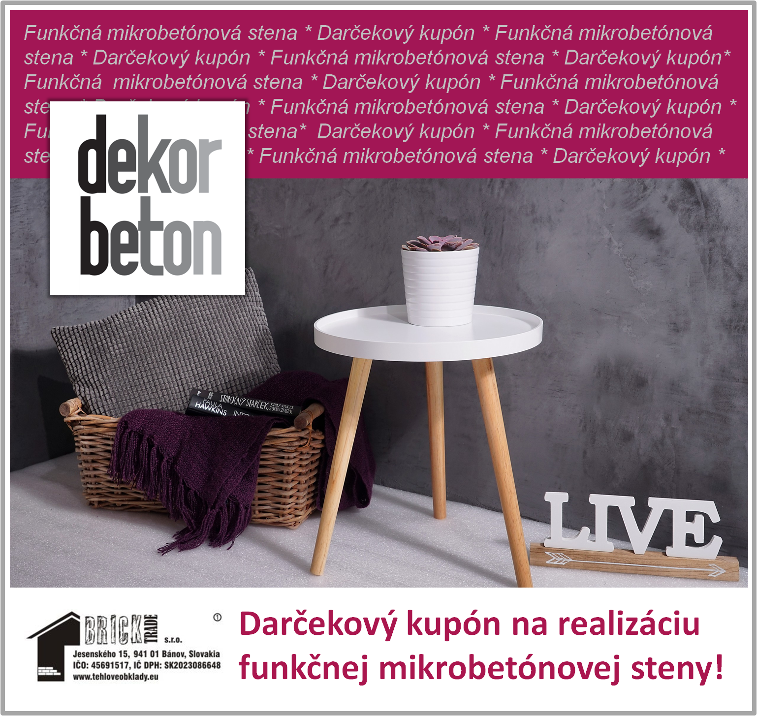 Obdarujte svojho blízkeho "Kupónom na funkčnú mikrobetónovú stenu". Vy si len rozmyslite, koľko chcete investovať, my kupón vytlačíme a zašleme prvou triedou. Tento darček sa Vám síce vmestí do obálky, ale je skutočne originálny a nielen na jeden deň!